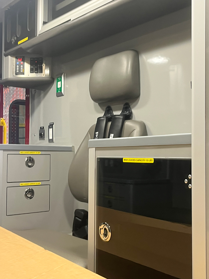 - Forward and rearward bench workstation with counter(s), drawers, storage, and IV warmer.